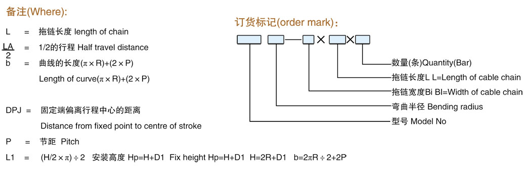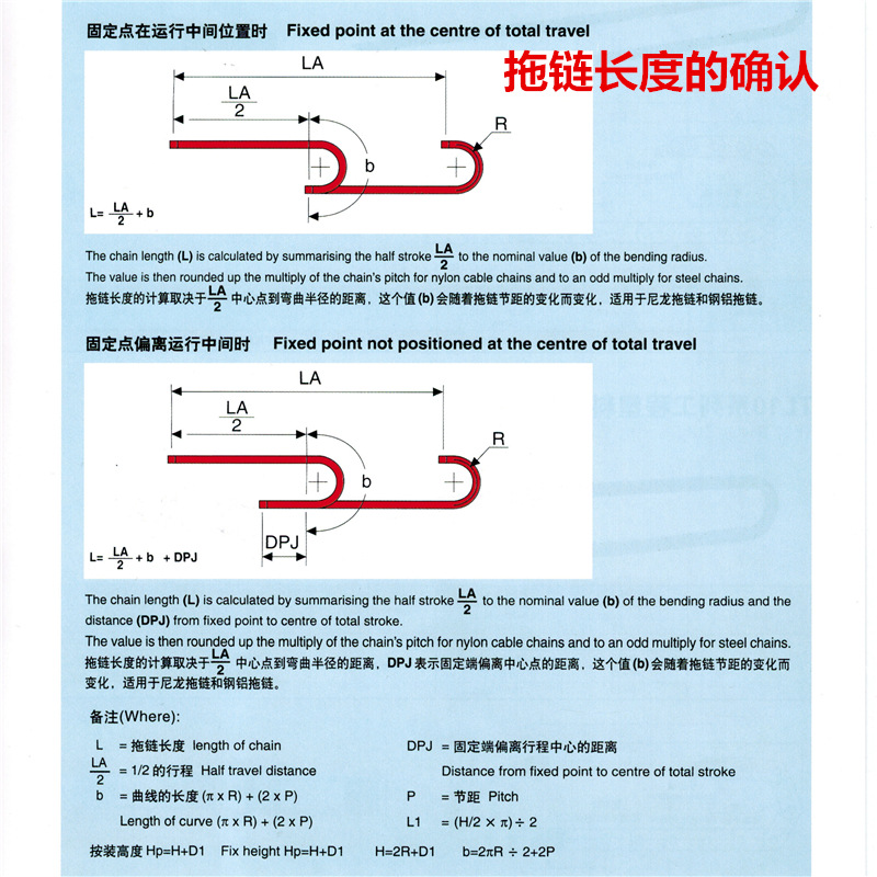 拖鏈長度的計(jì)算取決于LA/2中心點(diǎn)到彎曲半徑的距離,DPJ表示固定端偏離中心點(diǎn)的距離,這個(gè)值(b)會(huì)隨著拖鏈節(jié)距的變化而變化,適用于尼龍拖鏈和鋼鋁拖鏈。