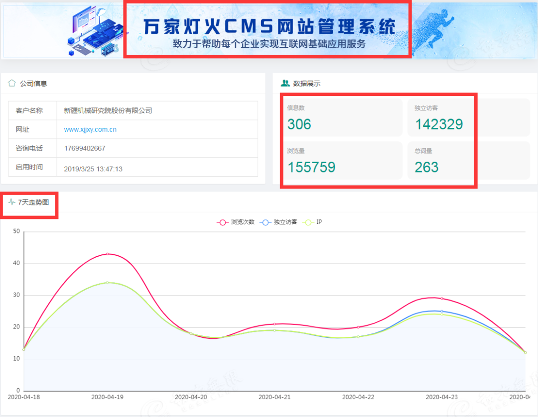 此次“萬家燈火CMS系統”的升級版,1. 在原有的基礎上,增加網站關鍵詞7天走勢圖以及網站關鍵詞在各大主流搜素引擎占比餅狀圖,將數據更加精細化,*化。