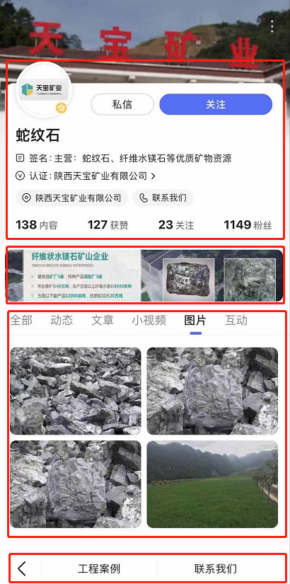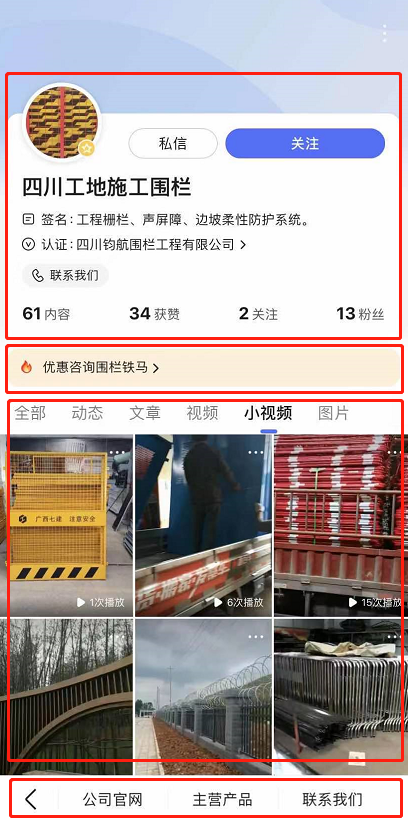 企業百家號主頁分5大模塊:固定頭部、品宣區、小程序、多樣內容、底部菜單。